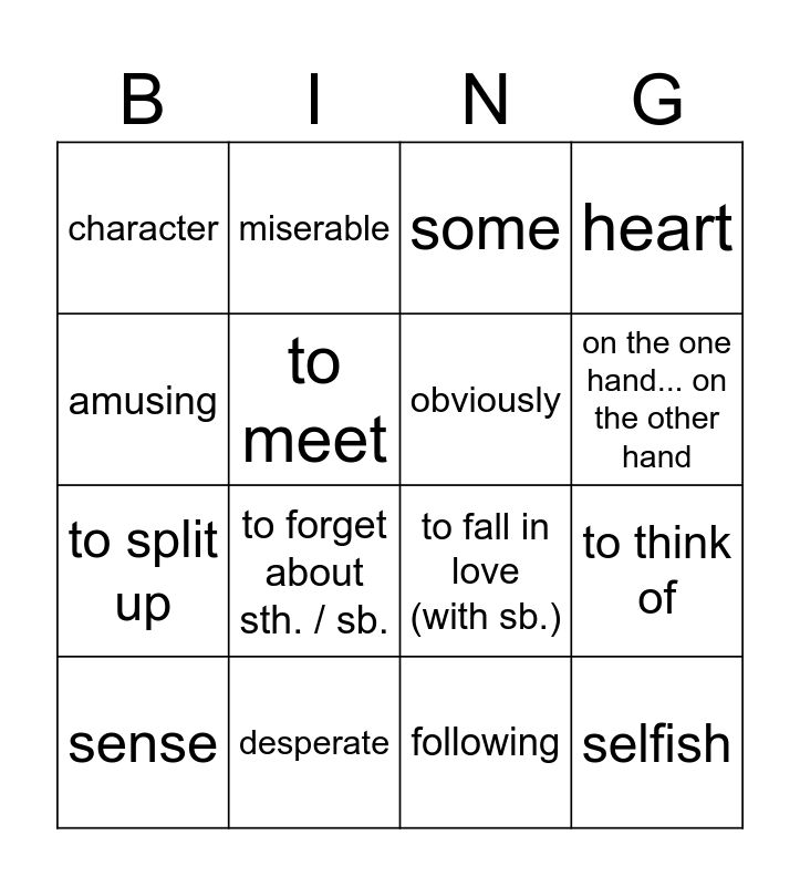 This bingo card has 28 words: might, to get married / to marry, to split up, boyfriend, to meet, some, miserable, selfish, desperate, to support, to fall in love (with sb.), heart, to make sb. do sth., difference, to forget about sth. / sb., nobody, perfectly, obviously, on the one hand... on the other hand, choice, character, guess, sense, to think of, following, helpful, amusing and to scan (for).