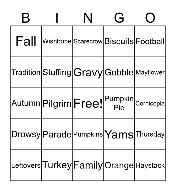 This bingo card has a free space and 30 words: Turkey, Mashed Potatoes, Pilgrim, Indian, Fall, Scarecrow, Stuffing, Pumpkins, Pumpkin Pie, Family, Cornicopia, Haystack, Orange, Yellow, Mayflower, Cranberries, Yams, Drowsy, Parade, Football, Autumn, Carve, Wishbone, Gobble, Tradition, Biscuits, Thursday, Leftovers, Gravy and Acorns.