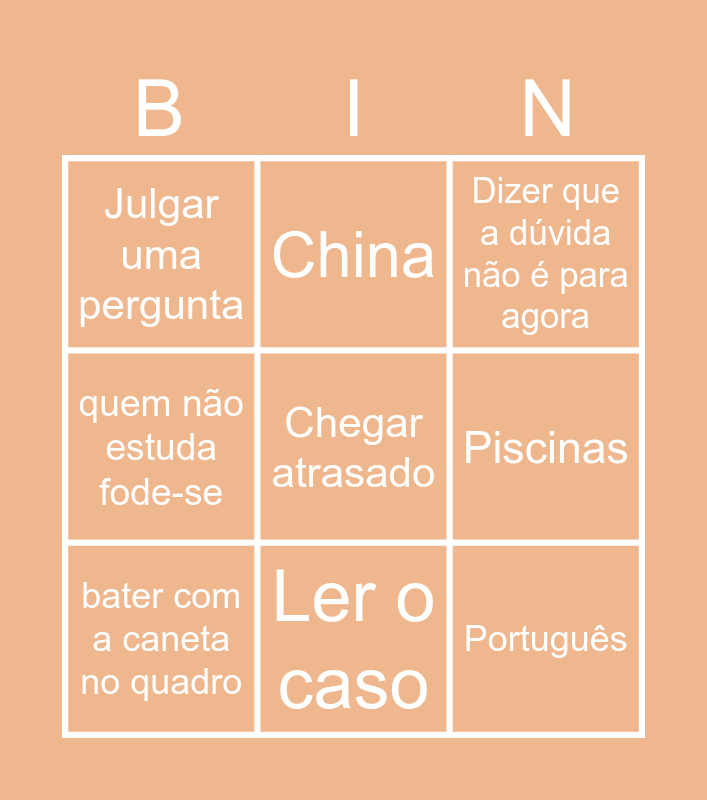 This bingo card has a free space and 24 words: Jóia, Sair da sala, Ler o caso, Reclamar/Julgar a turma, Português, Julgar uma pergunta, Piscinas, China, Cantarolar, não querem estar aqui podem ir embora, isto não é revisão da teórica, Falar chinês, Cegueira, falar com os olhos fechados, bater com a caneta no quadro, Cebola, falar do passado, Dizer que a dúvida não é para agora, voice crack, cerebro desliga a meio do pensamento, falta de respeito para com os outros, elogiar um aluno, quem não estuda fode-se and desenhos aleatórios no quadro.