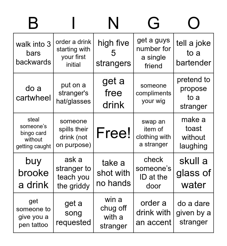 This bingo card has a free space and 26 words: take a shot with no hands, order a drink with an accent, get a free drink, get a song requested, tell a joke to a bartender, walk into 3 bars backwards, do a cartwheel, order a drink starting with your first initial, make a toast without laughing, check someone’s ID at the door, someone compliments your wig, steal someone’s bingo card without getting caught, skull a glass of water, get someone to give you a pen tattoo, someone spills their drink (not on purpose), steal an item, get a guys number for a single friend, buy brooke a drink, high five 5 strangers, do a dare given by a stranger, pretend to propose to a stranger, win a chug off with a stranger, swap an item of clothing with a stranger, ask a stranger to teach you the griddy, put on a stranger's hat/glasses and arm wrestle a stranger.