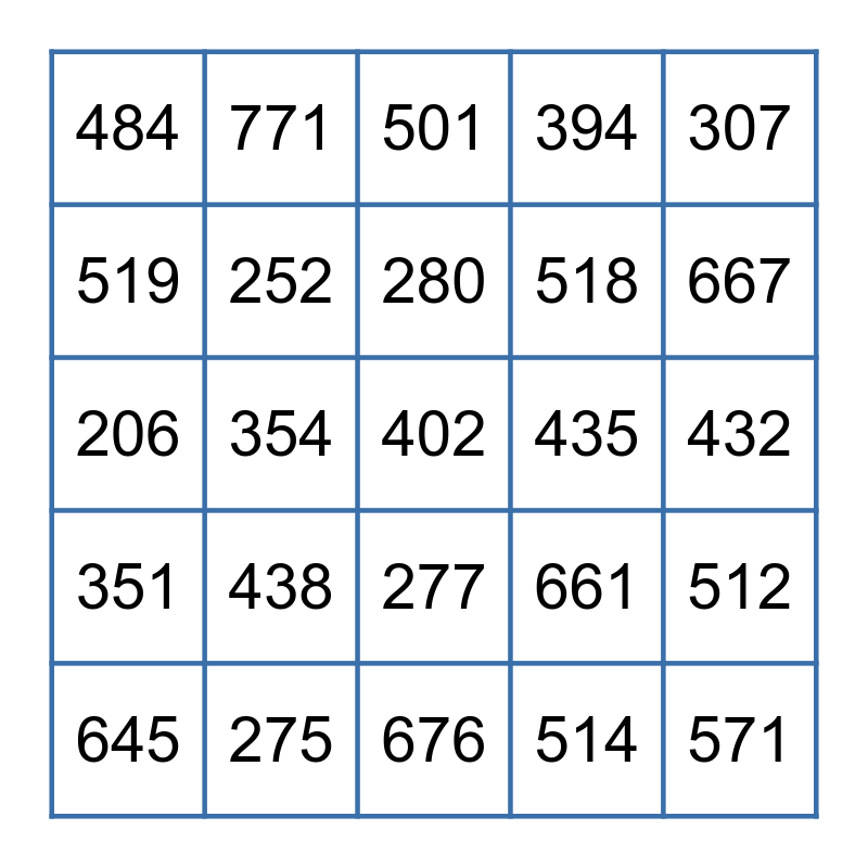 This bingo card has 40 words: 43, 206, 246, 252, 275, 277, 280, 291, 307, 351, 354, 394, 402, 432, 435, 438, 444, 484, 487, 501, 512, 514, 518, 519, 536, 543, 565, 568, 571, 635, 640, 645, 658, 661, 667, 676, 728, 731, 771 and 813.