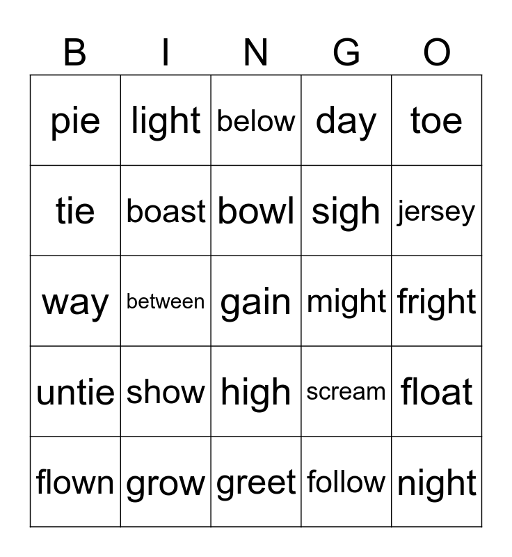 This bingo card has a free space and 24 words: show, grow, bowl, flown, toe, pie, tie, light, might, high, sigh, way, scream, float, boast, follow, fright, below, jersey, between, night, untie, day and greet.