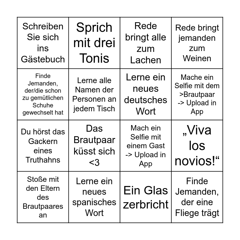 This bingo card has 20 words: Stoße mit den Eltern des Brautpaares an, Stoße mit Sekt an, Rede bringt alle zum Lachen, „Viva los novios!“, Schreib etwas ins Gästebuch, Das Brautpaar küsst sich <3, Ein Glas zerbricht, Rede bringt jemanden zum Weinen, Du hörst das Gackern eines Truthahns, Sprich mit drei Tonis, Mach ein Selfie mit einem Gast -> Upload in App, Mache ein Selfie mit dem >Brautpaar -> Upload in App, Schreiben Sie sich ins Gästebuch, Lerne ein neues spanisches Wort, Lerne ein neues deutsches Wort, "Prost", Finde Jemanden, der/die schon zu gemütlichen Schuhe gewechselt hat, Lerne alle Namen der Personen an jedem Tisch, Die Mutter von Mateu lacht sehr laut and Finde Jemanden, der eine Fliege trägt.