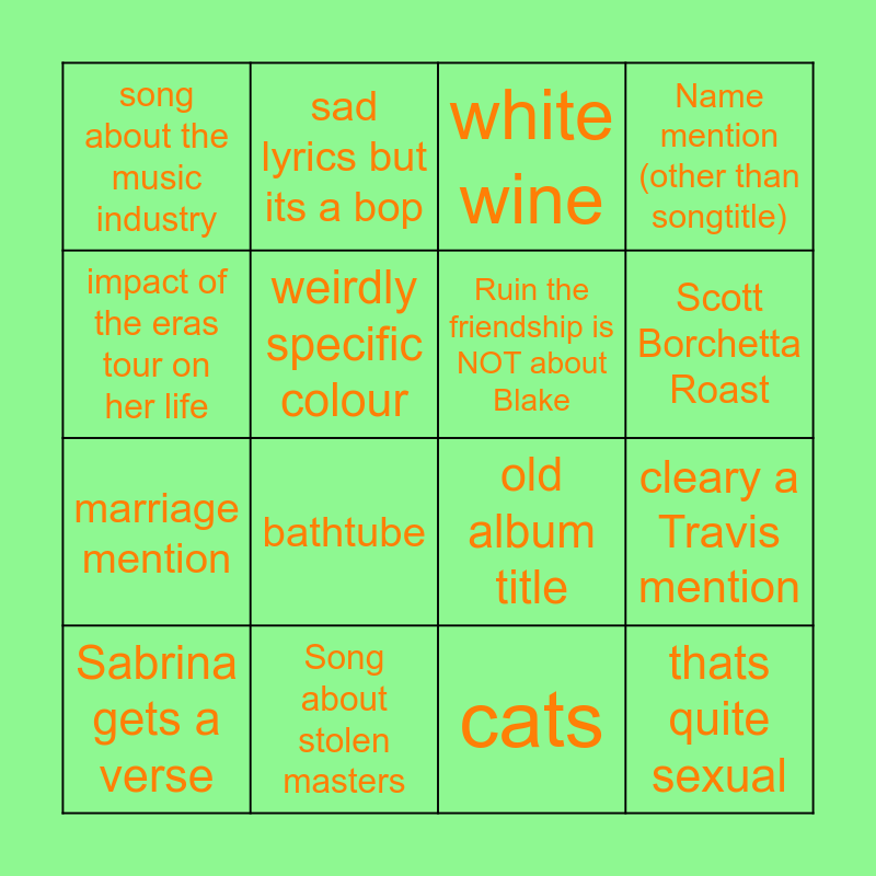 This bingo card has 16 words: Song about stolen masters, cleary a Travis mention, white wine, song about the music industry, marriage mention, sad lyrics but its a bop, old album title, cats, impact of the eras tour on her life, weirdly specific colour, Sabrina gets a verse, Name mention (other than songtitle), bathtube, Scott Borchetta Roast, Ruin the friendship is NOT about Blake and thats quite sexual.