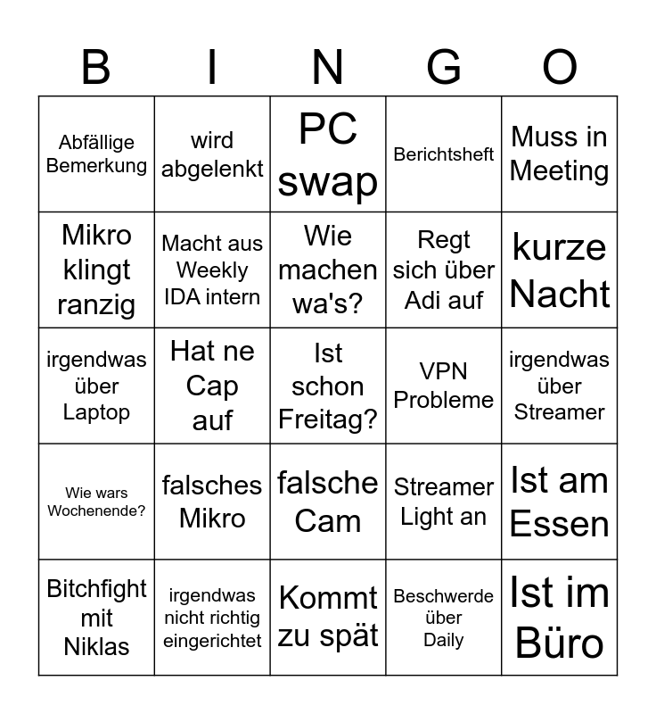 This bingo card has a free space and 24 words: falsches Mikro, irgendwas nicht richtig eingerichtet, Wie machen wa's?, Bitchfight mit Niklas, Muss in Meeting, Abfällige Bemerkung, Mikro klingt ranzig, wird abgelenkt, VPN Probleme, falsche Cam, Regt sich über Adi auf, irgendwas über Laptop, Streamer Light an, Ist am Essen, Macht aus Weekly IDA intern, Beschwerde über Daily, irgendwas über Streamer, PC swap, kurze Nacht, Hat ne Cap auf, Ist im Büro, Wie wars Wochenende?, Berichtsheft and Kommt zu spät.