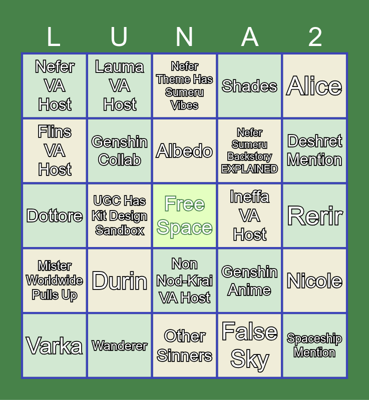 This bingo card has a free space and 24 words: Durin, Wanderer, Albedo, Varka, Alice, Nefer VA Host, Flins VA Host, Lauma VA Host, Ineffa VA Host, Non Nod-Krai VA Host, Nefer Sumeru Backstory EXPLAINED, Dottore, Genshin Anime, Nicole, Genshin Collab, False Sky, Rerir, Nefer Theme Has Sumeru Vibes, Deshret Mention, UGC Has Kit Design Sandbox, Spaceship Mention, Mister Worldwide Pulls Up, Shades and Other Sinners.