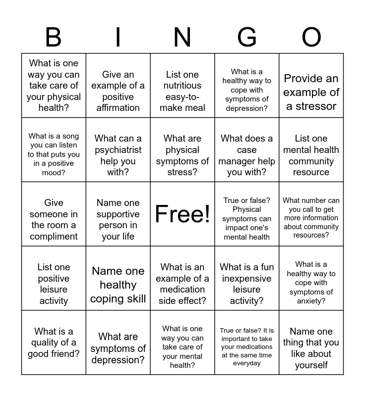 This bingo card has a free space and 24 words: What is a quality of a good friend?, Name one healthy coping skill, What are physical symptoms of stress?, True or false? It is important to take your medications at the same time everyday, Provide an example of a stressor, What is one way you can take care of your physical health?, Give an example of a positive affirmation, List one nutritious easy-to- make meal, True or false? Physical symptoms can impact one's mental health, What number can you call to get more information about community resources?, Give someone in the room a compliment, What can a psychiatrist help you with?, What is a fun inexpensive leisure activity?, What is a healthy way to cope with symptoms of anxiety?, What is a song you can listen to that puts you in a positive mood?, What are symptoms of depression?, What is one way you can take care of your mental health?, What is a healthy way to cope with symptoms of depression?, List one mental health community resource, List one positive leisure activity, Name one supportive person in your life, What is an example of a medication side effect?, What does a case manager help you with? and Name one thing that you like about yourself.
