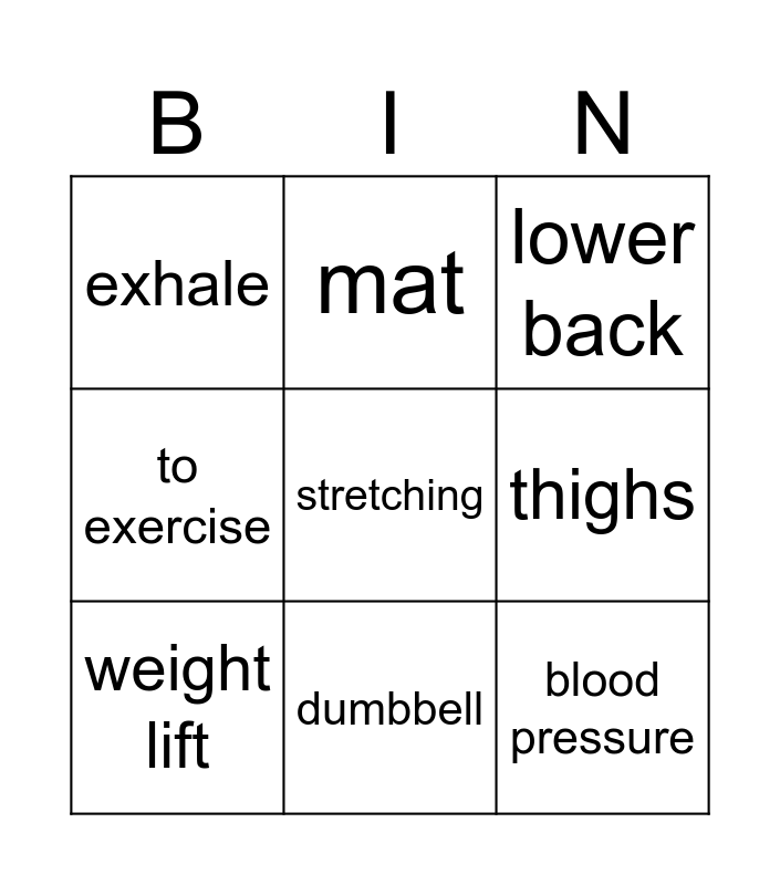 This bingo card has a free space and 8 words: thighs, lower back, mat, weight lift, exhale, blood pressure, to exercise and dumbbell.