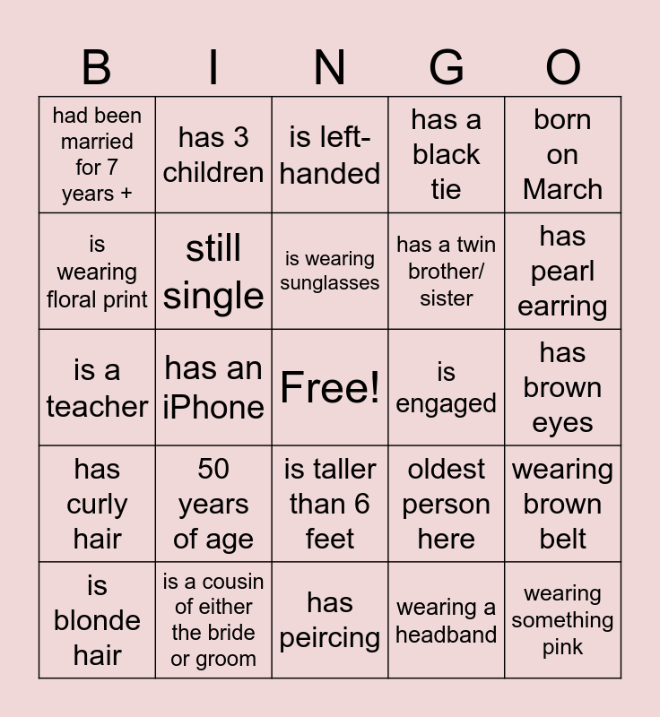 This bingo card has a free space and 29 words: has a tattoo, is a cousin of either the bride or groom, is left-handed, is wearing a watch, born on March, had been married for 7 years +, still single, is wearing sunglasses, is engaged, wearing brown belt, is blonde hair, has an iPhone, wearing a headband, wearing something pink, is a teacher, wearing a cap, has peircing, oldest person here, has pearl earring, has curly hair, 50 years of age, is a middle child, has a twin brother/ sister, has brown eyes, is wearing floral print, has 3 children, is taller than 6 feet, has a black tie and a chinita/ chinito.