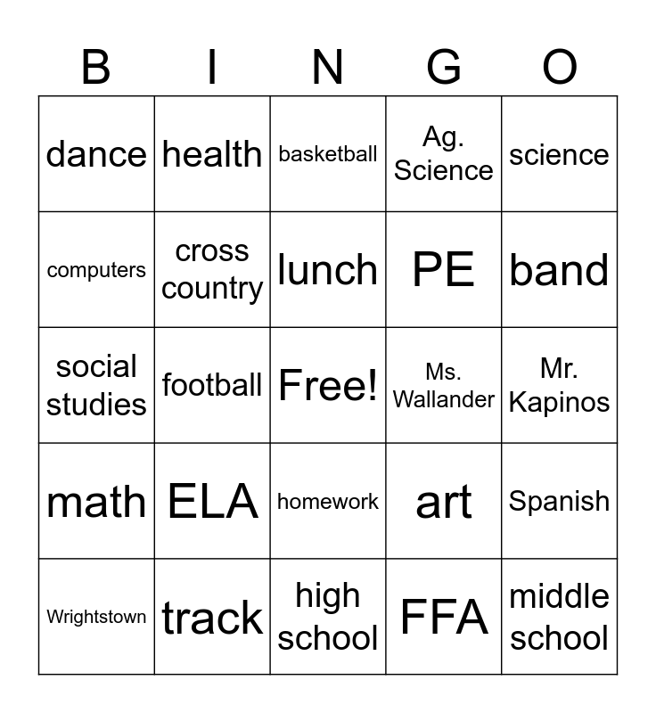 This bingo card has a free space and 29 words: Wrightstown, tigers, football, soccer, dance, basketball, cross country, ELA, Ms. Wallander, track, Mr. Kapinos, middle school, high school, FFA, band, choir, homework, math, science, social studies, art, tech. ed., PE, computers, Ag. Science, health, Spanish, lunch and recess.