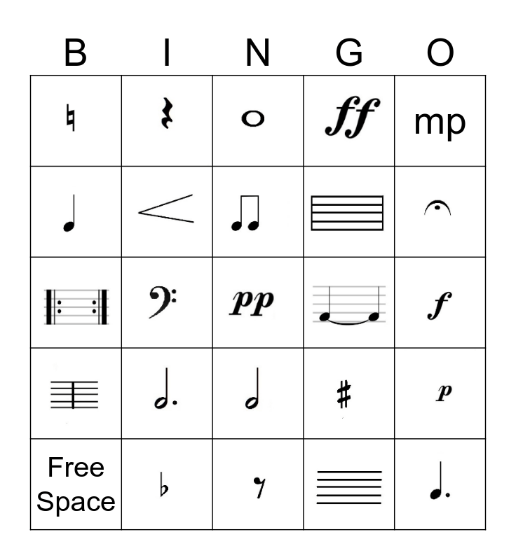 This bingo card has 24 images and 3 words: Free Space, mp and mf.