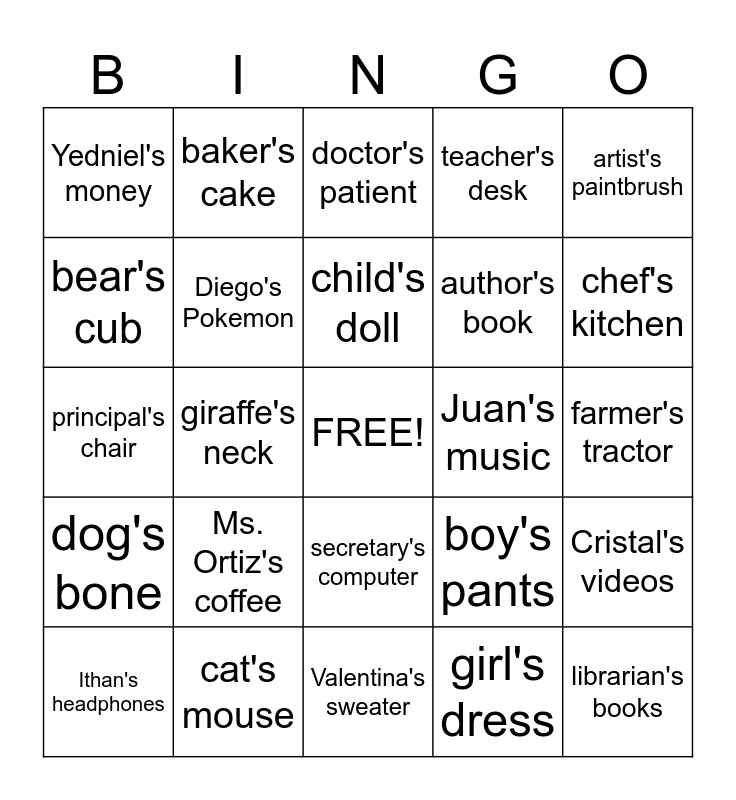 This bingo card has a free space and 24 words: Ms. Ortiz's coffee, cat's mouse, child's doll, Ithan's headphones, artist's paintbrush, Yedniel's money, bear's cub, baker's cake, Juan's music, secretary's computer, author's book, principal's chair, boy's pants, Cristal's videos, Diego's Pokemon, girl's dress, farmer's tractor, doctor's patient, chef's kitchen, giraffe's neck, librarian's books, dog's bone, teacher's desk and Valentina's sweater.