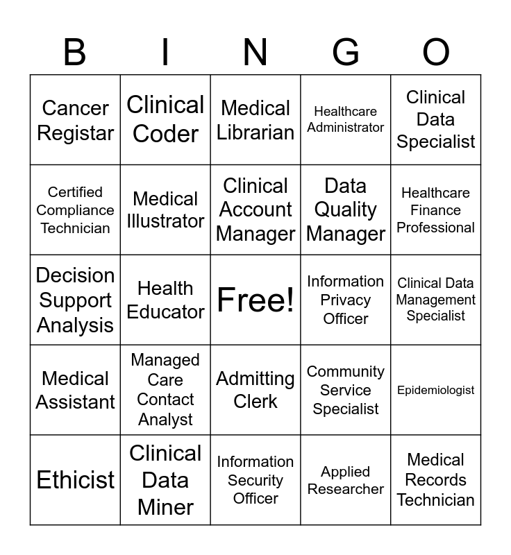This bingo card has a free space and 26 words: Admitting Clerk, Applied Researcher, Clinical Account Manager, Clinical Data Miner, Clinical Data Specialist, Cancer Registar, Certified Compliance Technician, Clinical Coder, Clinical Data Management Specialist, Community Service Specialist, Data Quality Manager, Decision Support Analysis, Epidemiologist, Ethicist, Health Educator, Health Information Administrator, Healthcare Administrator, Medical Assistant, Medical Librarian, Medical Records Technician, Healthcare Finance Professional, Information Security Officer, Information Privacy Officer, Managed Care Contact Analyst, Medical Illustrator and Medical Information Technologist.