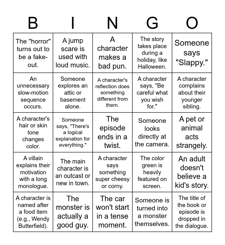 This bingo card has a free space and 24 words: The main character is an outcast or new in town., The monster is actually a good guy., A character's reflection does something different from them., A character is named after a food item (e.g., Wendy Butterfield)., Someone says "Slappy.", The "horror" turns out to be a fake-out., An unnecessary slow-motion sequence occurs., A jump scare is used with loud music., Someone looks directly at the camera., A character says something super cheesy or corny., A character says, "Be careful what you wish for.", A character's hair or skin tone changes color., The color green is heavily featured on screen., An adult doesn't believe a kid's story., Someone explores an attic or basement alone., Someone is turned into a monster themselves., A pet or animal acts strangely., A character makes a bad pun., A character complains about their younger sibling., Someone says, "There's a logical explanation for everything.", The title of the book or episode is dropped in the dialogue., A villain explains their motivation with a long monologue., The story takes place during a holiday, like Halloween. and The car won't start in a tense moment..
