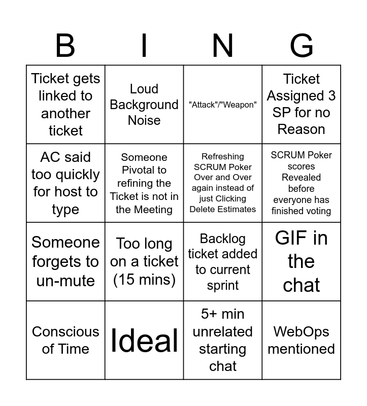 This bingo card has 51 words: Duplicate Ticket, Conscious of Time, Let's have a great day, Question Directed at David, Overrun Time, BRB, Loud Background Noise, Meeting started by Developer, Someone Pivotal to refining the Ticket is not in the Meeting, Someone has to leave Early for another Meeting, Refreshing SCRUM Poker Over and Over again instead of just Clicking Delete Estimates, Ticket Assigned 3 SP for no Reason, Ticket gets Discarded, Someone says that's a Product Question, Someone is called out for not Pointing a Ticket, Release Train Mentioned, SCRUM Poker scores Revealed before everyone has finished voting, Ideal, "I'm just listening in", AC said too quickly for host to type, GIF in the chat, AWS Mentioned, Ticket gets linked to another ticket, Someone forgets to un-mute, Milton Anecdote, Hand up, Too long on a ticket (15 mins), Verbatim reads description to explain ticket, Someone gets talked over/interupted, "Attack"/"Weapon", UCD team there but nothing is asked of them, "[yeah, but no]", "Could you repeat that?" (Not listening), Talk about old/in-progress tickets, Dean is doing something important and does not hear, Points assigned without unanimous vote, Concern raised but swept under the rug, "Jira Difficulties", Someone arrives 5+ mins late, Laugh, 5+ min unrelated starting chat, WebOps mentioned, Comment left on ticket, QAs there but nothing is asked of them, Thats a BA question, Ticket assigned to Milton, Backlog ticket added to current sprint, G7+ mentioned, Non BG member mentioned, Thumbs Up React in Chat and Non-Thumbs Up React in Chat.