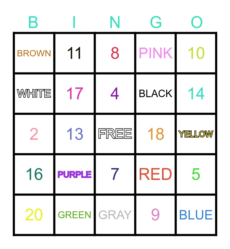 This bingo card has a free space and 32 words: 9, 1, 13, 3, 16, 17, 10, 5, 11, 6, 4, 8, 15, 19, 18, 12, 20, 2, 7, PURPLE, RED, ORANGE, YELLOW, GREEN, BLUE, PINK, BLACK, WHITE, BROWN, GRAY, VIOLET and 14.