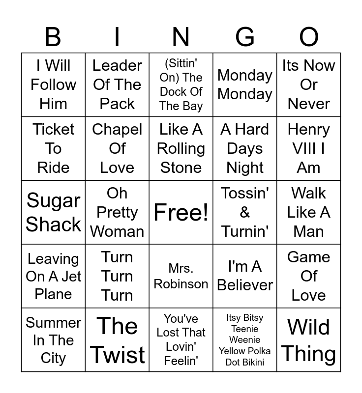 This bingo card has a free space and 24 words: Summer In The City, Turn Turn Turn, Like A Rolling Stone, Itsy Bitsy Teenie Weenie Yellow Polka Dot Bikini, Its Now Or Never, I Will Follow Him, Leader Of The Pack, (Sittin' On) The Dock Of The Bay, Tossin' & Turnin', Walk Like A Man, Sugar Shack, Chapel Of Love, I'm A Believer, Game Of Love, Ticket To Ride, The Twist, You've Lost That Lovin' Feelin', Monday Monday, Henry VIII I Am, Leaving On A Jet Plane, Oh Pretty Woman, Mrs. Robinson, A Hard Days Night and Wild Thing.