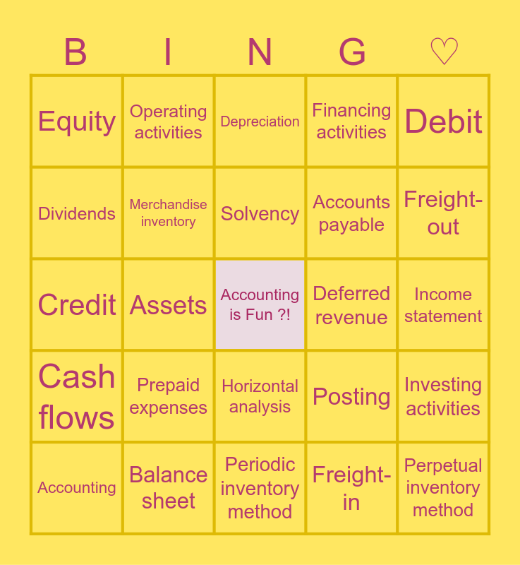This bingo card has a free space and 29 words: Accounting, Chart of accounts, Assets, Liabilities, Equity, Depreciation, Merchandise inventory, Prepaid expenses, Deferred revenue, Balance sheet, Income statement, Perpetual inventory method, Periodic inventory method, Freight-in, Freight-out, Vertical analysis, Horizontal analysis, Cash flows, Debit, Credit, Posting, Accounts receivable, Accounts payable, Dividends, Financing activities, Operating activities, Investing activities, Solvency and Liquidity.
