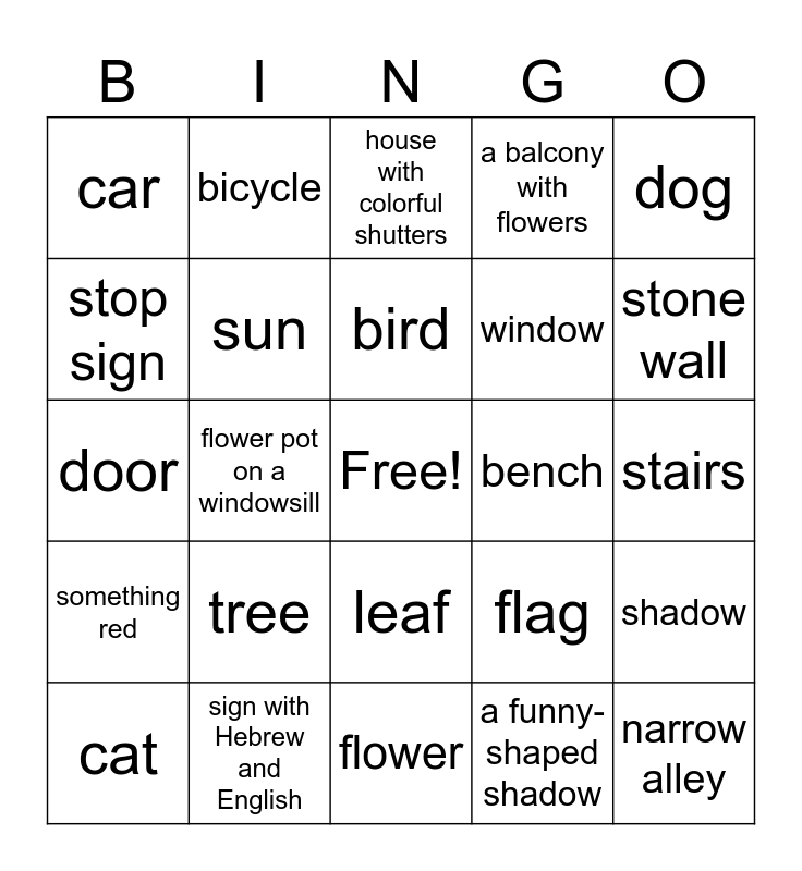 This bingo card has a free space and 25 words: tree, flower, bird, cat, dog, car, stop sign, bicycle, bench, leaf, window, door, flag, shadow, sun, insect, stairs, house with colorful shutters, stone wall, flower pot on a windowsill, narrow alley, sign with Hebrew and English, something red, a balcony with flowers and a funny-shaped shadow.