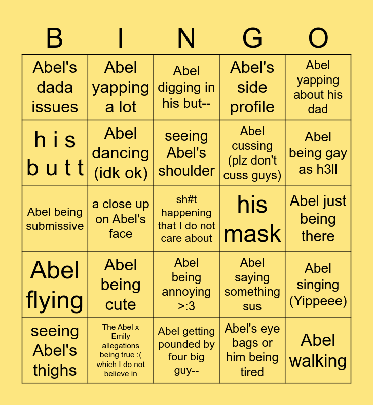 This bingo card has a free space and 24 words: Abel being cute, The Abel x Emily allegations being true :( which I do not believe in, seeing Abel's shoulder, seeing Abel's thighs, Abel yapping about his dad, Abel's dada issues, h i s b u t t, Abel yapping a lot, his mask, Abel being annoying >:3, Abel cussing (plz don't cuss guys), Abel being submissive, Abel saying something sus, Abel singing (Yippeee), Abel dancing (idk ok), Abel's eye bags or him being tired, Abel just being there, Abel digging in his but--, Abel being gay as h3ll, a close up on Abel's face, Abel walking, Abel flying, Abel's side profile and Abel getting pounded by four big guy--.