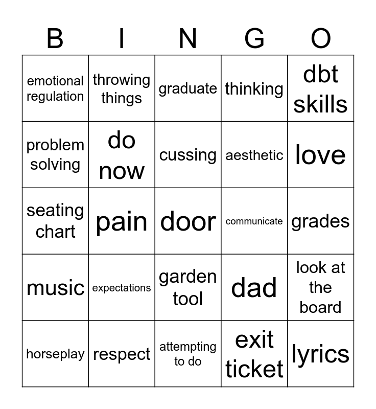 This bingo card has a free space and 24 words: expectations, respect, cussing, horseplay, dbt skills, emotional regulation, problem solving, throwing things, communicate, garden tool, aesthetic, seating chart, dad, look at the board, do now, exit ticket, grades, graduate, love, pain, lyrics, music, thinking and attempting to do.