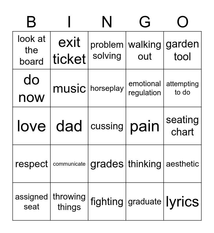 This bingo card has a free space and 24 words: communicate, throwing things, horseplay, assigned seat, garden tool, look at the board, do now, exit ticket, pain, grades, emotional regulation, love, thinking, aesthetic, music, graduate, seating chart, problem solving, attempting to do, dad, lyrics, respect, walking out and fighting.