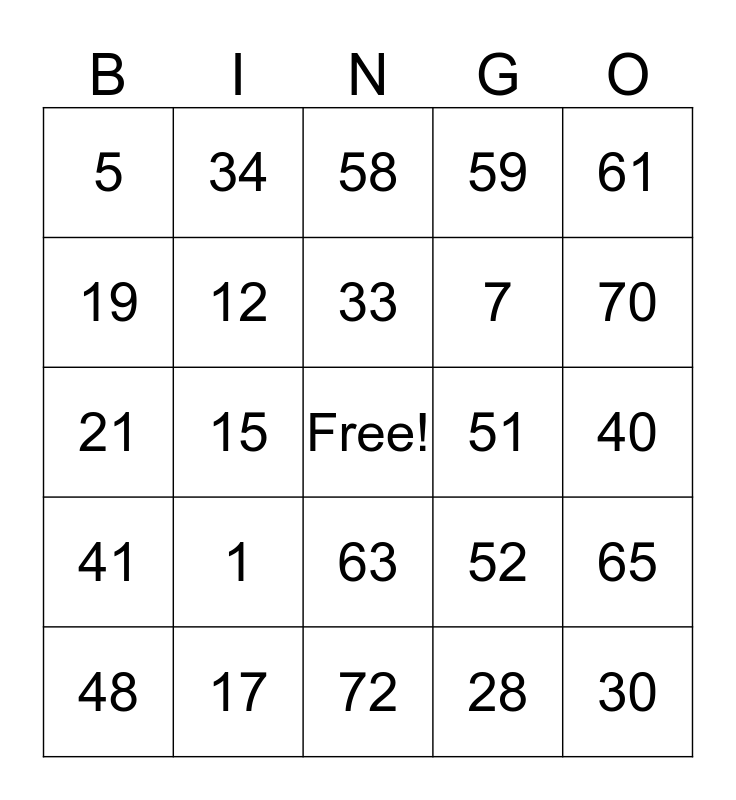 This bingo card has a free space and 24 words: 1, 17, 33, 48, 61, 5, 19, 34, 51, 63, 7, 21, 52, 65, 12, 28, 40, 58, 70, 15, 30, 41, 59 and 72.