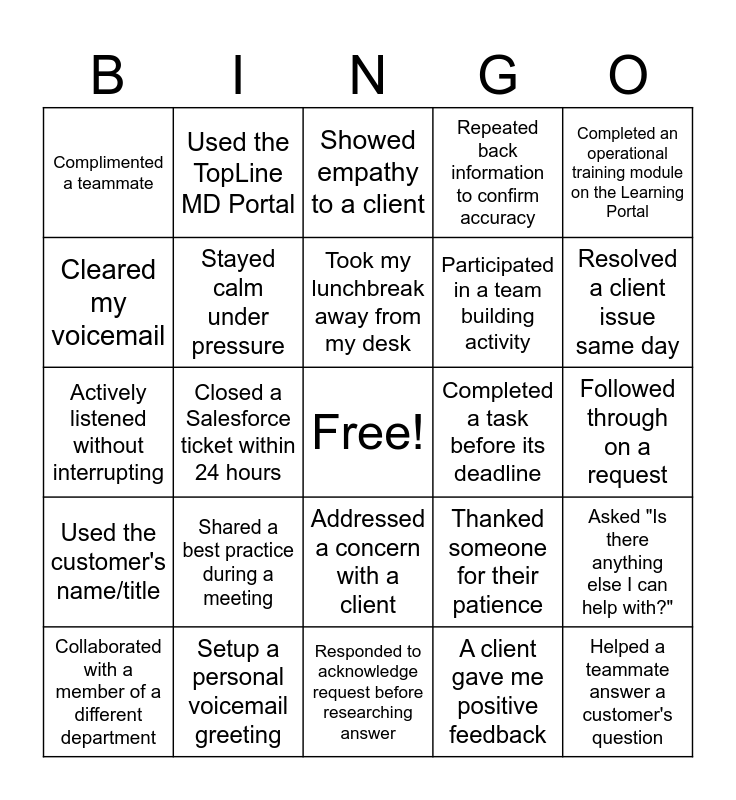 This bingo card has a free space and 24 words: Shared a best practice during a meeting, Setup a personal voicemail greeting, Took my lunchbreak away from my desk, Collaborated with a member of a different department, Completed an operational training module on the Learning Portal, Complimented a teammate, Cleared my voicemail, Used the TopLine MD Portal, Completed a task before its deadline, Addressed a concern with a client, Participated in a team building activity, Actively listened without interrupting, Thanked someone for their patience, Asked "Is there anything else I can help with?", Stayed calm under pressure, A client gave me positive feedback, Followed through on a request, Showed empathy to a client, Resolved a client issue same day, Closed a Salesforce ticket within 24 hours, Helped a teammate answer a customer's question, Used the customer's name/title, Repeated back information to confirm accuracy and Responded to acknowledge request before researching answer.
