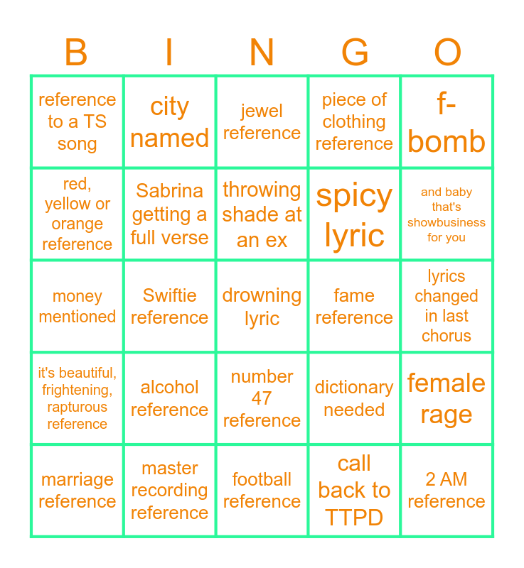 This bingo card has a free space and 48 words: midnight reference, 2 AM reference, car reference, football reference, alcohol reference, drug reference, city named, city/ town metaphor, red, yellow or orange reference, any other colour mentioned, Sabrina getting a full verse, piece of clothing reference, female rage, dictionary needed, Eras Tour mentioned, religious metaphor, throwing shade at an ex, fame reference, Shakespeare retellling, f-bomb, Swiftie reference, call back to TTPD, reference to a TS song, spicy lyric, witchy lyric, and baby that's showbusiness for you, marriage reference, rollercoaster reference, number 47 reference, it's beautiful, frightening, rapturous reference, sparkling, bedazzling, bejewelled reference, youth or aging reference, murder reference, depression reference, master recording reference, Snake Gate reference, the prophecy reference, lyrics changed in last chorus, laughing in the song, I cry, Pinocchio reference, spoken word in song, jewel reference, perfume reference, money mentioned, glitter mentioned, Travis mentioned and at least 5 names mentioned.
