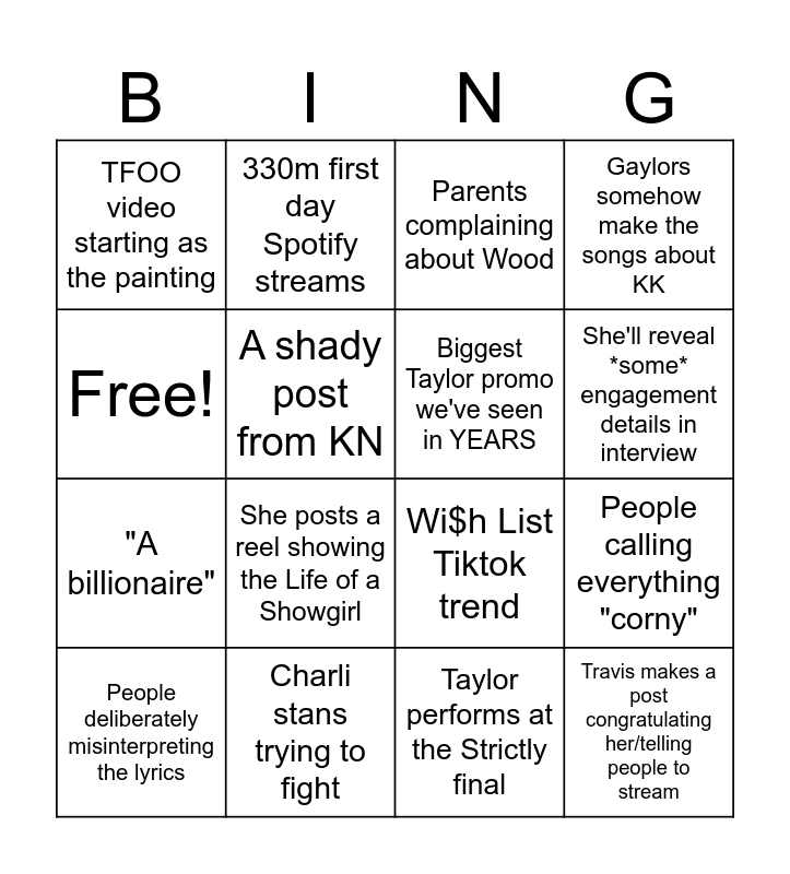 This bingo card has 16 words: Charli stans trying to fight, People calling everything "corny", Parents complaining about Wood, TFOO video starting as the painting, "A billionaire", 330m first day Spotify streams, Wi$h List Tiktok trend, Taylor performs at the Strictly final, Free!, A shady post from KN, People deliberately misinterpreting the lyrics, Gaylors somehow make the songs about KK, She posts a reel showing the Life of a Showgirl, She'll reveal *some* engagement details in interview, Biggest Taylor promo we've seen in YEARS and Travis makes a post congratulating her/telling people to stream.