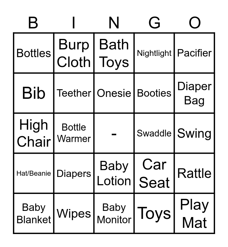 This bingo card has a free space and 24 words: Diapers, Wipes, Onesie, Baby Blanket, Pacifier, Bottles, Bib, Burp Cloth, Swaddle, Baby Lotion, Booties, High Chair, Car Seat, Rattle, Teether, Toys, Swing, Bath Toys, Diaper Bag, Bottle Warmer, Play Mat, Hat/Beanie, Nightlight and Baby Monitor.