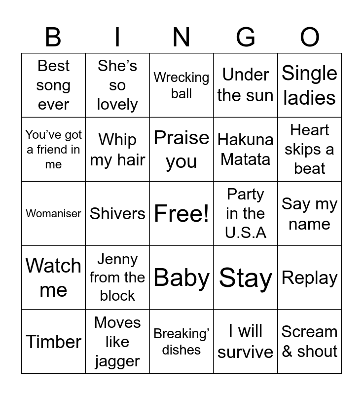 This bingo card has a free space and 34 words: Born in the U.S.A, I will survive, Circle of life, Superman, Watch me, Whip my hair, Single ladies, Timber, She’s so lovely, I like to move it, Praise you, Wrecking ball, Sk8ter boi, Beauty and the beast, Party in the U.S.A, Heart skips a beat, Moves like jagger, Womaniser, Jenny from the block, Stay, Baby, Bang bang, Best song ever, Say my name, Breaking’ dishes, Scream & shout, Under the sun, A whole new world, Hakuna Matata, You’ve got a friend in me, We’re all in this together, Shivers, Replay and Love story.