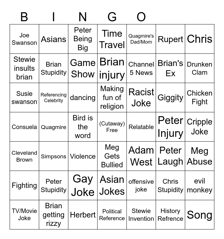 This bingo card has a free space and 55 words: Stewie Invention, Chicken Fight, Lois, Joe Swanson, Quagmire, Peter Stupidity, Chris, Pedo, Brian Stupidity, Gay Joke, Time Travel, Meg Abuse, Cripple Joke, Peter Injury, TV/Movie Joke, Cleveland Brown, Quagmire's Dad/Mom, Channel 5 News, History Refrence, Brian's Ex, Drunken Clam, Simpsons, Racist Joke, Peter Being Big, Homophobia, Stewie insults brian, Bird is the word, Bonny swanson, Susie swanson, Giggity, Quagmire Gets freaky, Peter Laugh, evil monkey, Brian getting rizzy, Rupert, Brian injury, Fighting, Referencing Celebrity, Song, Violence, Asians, Asian Jokes, offensive joke, out of pocket, dancing, Consuela, Herbert, Adam West, Relatable, Game Show, Meg Gets Bullied, Chris Stupidity, Political Reference, Making fun of religion and Brian and stewie.