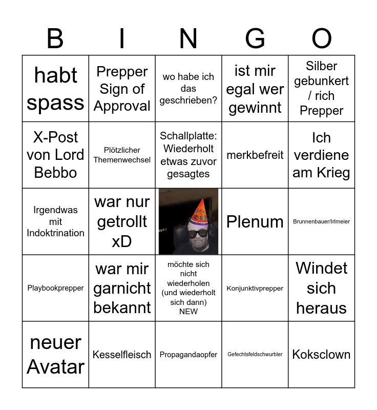 This bingo card has a free space and 79 words: Ukraine morgen dod, beweis mir das erstmal, wo habe ich das geschrieben?, Quelle?, ÖRR = Lügenpresse, ist mir egal, wurde hier schon gepostet such selber, X-Post von Zentrale Ermittlungsstelle, Russland hat Atomwaffen, dummes YT-Video/Gif/Bild ohne Kontext, ich bin neutral, +zwinkersmiley+, ist mir egal wer gewinnt, habt spass, irgendwas mit Intellekt, X-Post von Lord Bebbo, X-Post von der Olga, war mir garnicht bekannt, die Südfront!!!!!!, Brunnenbauer/Irlmeier, Investmentprepper, Silber gebunkert / rich Prepper, Irgendwas mit Indoktrination, Schallplatte: Wiederholt etwas zuvor gesagtes, Plötzlicher Themenwechsel, Ukrainenazis, Aber die USA!, Biowaffenlabore, Ignorliste, Soutfront Quelle, Ich verdiene am Krieg, Euer Weltbild, Propagandaopfer, Massenpsychose, neuer Avatar, Plenum, irgendwas mit kognitiv, "wie er es ist", Tagesschauhass, Koksclown, Hunter Biden Leaks, Zensor ist pinkeln, X-Post von Lord Bebo, Wird beim Lügen erwischt, Wechselt hastig das Thema, Prepper Sign of Approval, "Ich hatte Recht", "Habe ich schon immer gesagt", "Aber die USA/NATO/der Westen", Benutzt Lügenpressequellen, Windet sich heraus, war nur getrollt xD, Konjunktivprepper, Nuland dies das, Dyslexieprepper, Clown to clown communication, Russland kommt bis nach Aachen und Lyon, nicht von sich auf andere schließen, topp, möchte sich nicht wiederholen (und wiederholt sich dann) NEW, merkbefreit, MIETFREI, damit ich das richtig verstehe..., wer bist du?, Konjunktivprepper, Tituliert andere als Winggel, Coronaanspielung im Kriegsfaden, wird mett, ^^, Playbookprepper, Kesselfleisch, Organklau, Preppi-Fremdwortkirmes, Preppi Ænglisc Massacre, Aha, Gefechtsfeldschwurbler, random x-post ohne Quelle, "trust me bro" and das ist nicht meine Meinung.