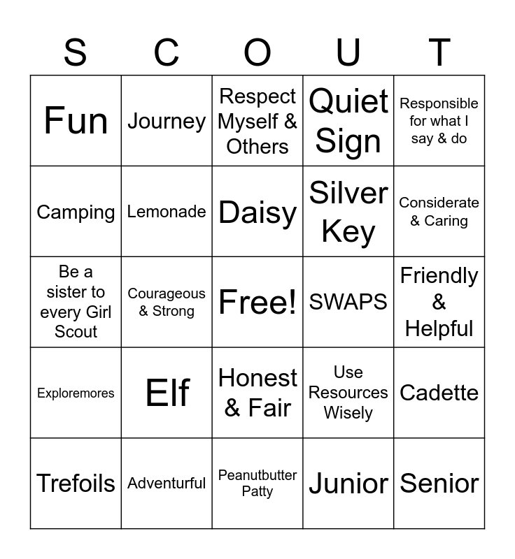 This bingo card has a free space and 42 words: Juliette Low, Daisy, Brownie, Elf, Junior, Cadette, Senior, Ambassador, Respect Myself & Others, Honest & Fair, Friendly & Helpful, Considerate & Caring, Courageous & Strong, Responsible for what I say & do, Respect Authority, Use Resources Wisely, Make the world a better place, Be a sister to every Girl Scout, Badge, Journey, Camping, Community Service, S'mores, Fun, Games, Pearls, Silver Key, Cookies, Thin Mint, Peanut Butter Sandwich, Carmel Delight, Exploremores, Lemonade, Peanutbutter Patty, Gluten Free Chocolate Chip, Trefoils, Adventurful, SWAPS, GORP, World Thinking Day, Quiet Sign and Kaper Chart.