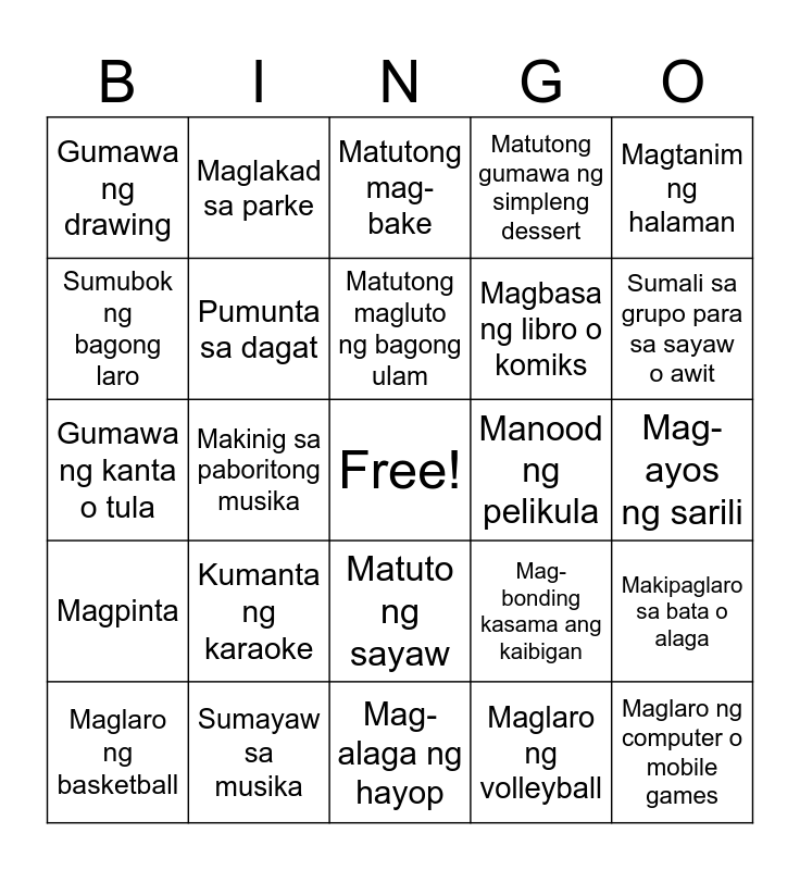 This bingo card has a free space and 24 words: Kumanta ng karaoke, Sumayaw sa musika, Matutong magluto ng bagong ulam, Maglaro ng basketball, Magtanim ng halaman, Gumawa ng drawing, Sumubok ng bagong laro, Maglakad sa parke, Manood ng pelikula, Matuto ng sayaw, Magbasa ng libro o komiks, Gumawa ng kanta o tula, Mag-bonding kasama ang kaibigan, Makipaglaro sa bata o alaga, Pumunta sa dagat, Maglaro ng volleyball, Mag-ayos ng sarili, Matutong mag-bake, Sumali sa grupo para sa sayaw o awit, Makinig sa paboritong musika, Maglaro ng computer o mobile games, Magpinta, Matutong gumawa ng simpleng dessert and Mag-alaga ng hayop.