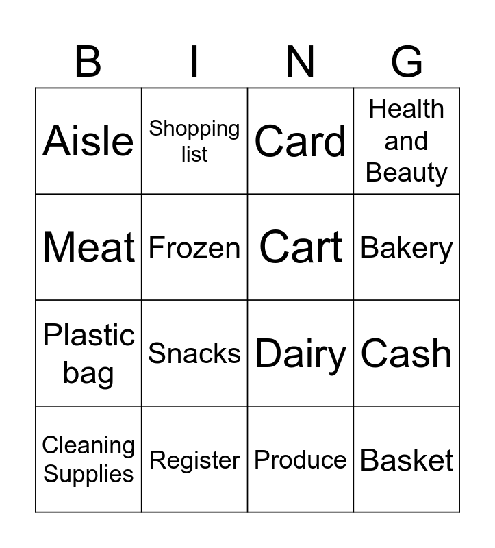 This bingo card has 16 words: Register, Cash, Card, Aisle, Plastic bag, Shopping list, Dairy, Produce, Meat, Frozen, Cleaning Supplies, Health and Beauty, Snacks, Bakery, Cart and Basket.