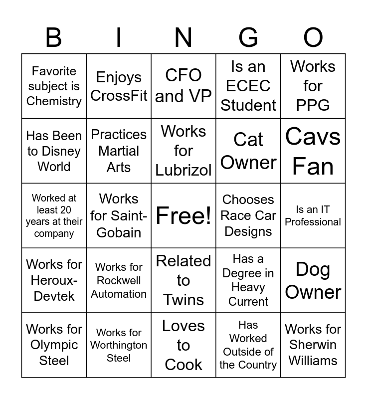 This bingo card has a free space and 24 words: Works for Rockwell Automation, Works for Worthington Steel, Works for Lubrizol, Works for Olympic Steel, Works for PPG, Favorite subject is Chemistry, Has Been to Disney World, Enjoys CrossFit, Chooses Race Car Designs, Related to Twins, Cat Owner, Worked at least 20 years at their company, Has a Degree in Heavy Current, Dog Owner, Practices Martial Arts, Has Worked Outside of the Country, Is an IT Professional, CFO and VP, Cavs Fan, Works for Saint-Gobain, Works for Sherwin Williams, Works for Heroux-Devtek, Is an ECEC Student and Loves to Cook.