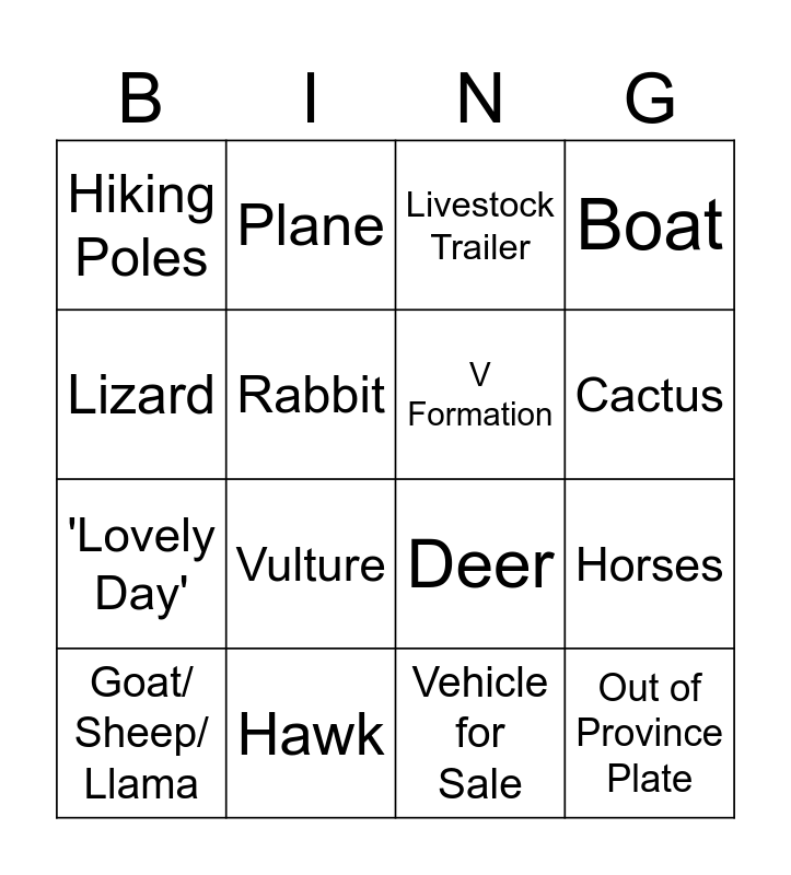 This bingo card has 25 words: Snake, Berry Bush, Cactus, Duck, Lizard, Hiking Poles, Rabbit, Plane, Hawk, Dog, 'Lovely Day', Deer, Cars, One Tree, V Formation, Big Stick, Vehicle for Sale, Livestock Trailer, Vulture, Horses, Goat/ Sheep/ Llama, Attraction Sign, Out of Province Plate, Boat and Community Event Sign.