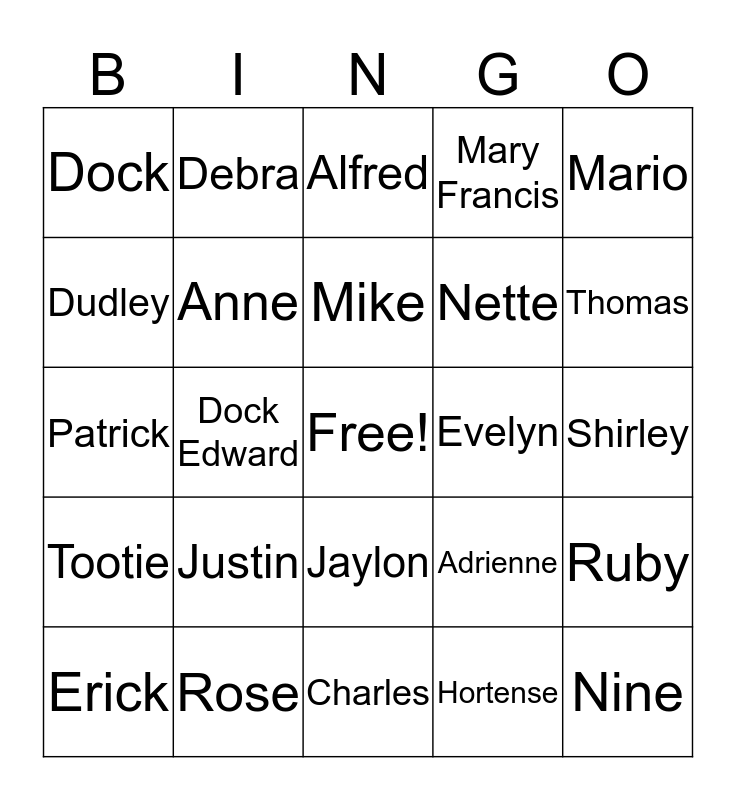 This bingo card has a free space and 24 words: Justin, Rose, Mike, Erick, Mario, Dock, Dudley, Debra, Evelyn, Jaylon, Nette, Patrick, Adrienne, Ruby, Anne, Hortense, Shirley, Alfred, Thomas, Dock Edward, Nine, Tootie, Mary Francis and Charles.