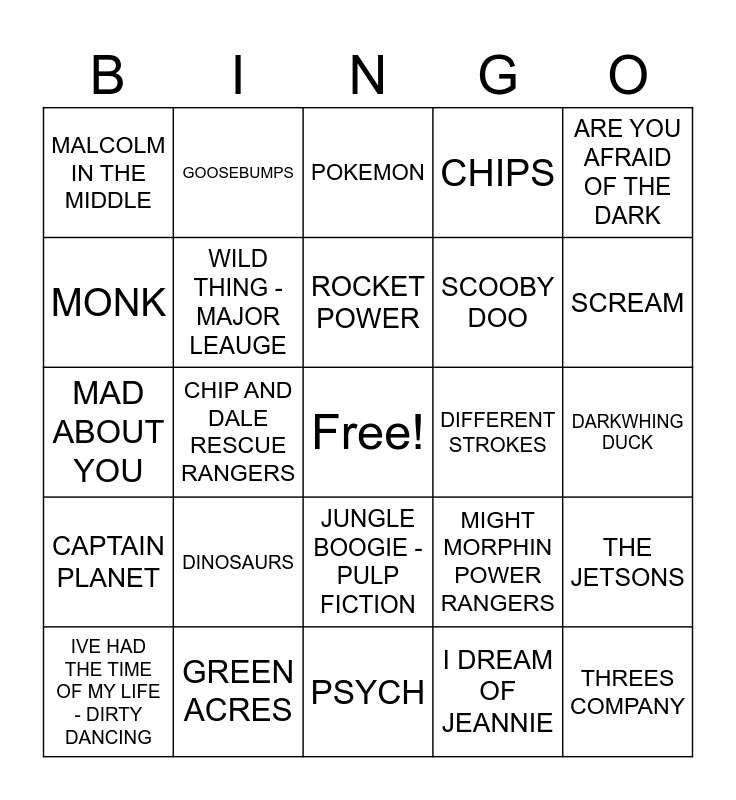 This bingo card has a free space and 39 words: KISS FROM A ROSE - BATMAN FOREVER, GOONIES, WITH A LITTLE HELP FROM MY FRIENDS - WONDER YEARS, WILD THING - MAJOR LEAUGE, IVE HAD THE TIME OF MY LIFE - DIRTY DANCING, JUNGLE BOOGIE - PULP FICTION, ROCKET POWER, RUGRATS, ARE YOU AFRAID OF THE DARK, CAPTAIN PLANET, CHIP AND DALE RESCUE RANGERS, CHIPS, THREES COMPANY, DARKWHING DUCK, DIFFERENT STROKES, DINOSAURS, GILLIGANS ISLAND, MALCOLM IN THE MIDDLE, MARY TYLER MOORE, MIGHT MORPHIN POWER RANGERS, MONK, PSYCH, SCOOBY DOO, SCREAM, SISTER SISTER, STEP BY STEP, STRANGER THINGS, TALESPIN, TEENAGE MUTANT NINJA TURTLES, GOOSEBUMPS, YOUR THE BEST - KARATE KID, EYE TO EYE - A GOOFY MOVIE, POKEMON, GREEN ACRES, I DREAM OF JEANNIE, BEWITCHED, THE JETSONS, MAD ABOUT YOU and WHOS THE BOSS.