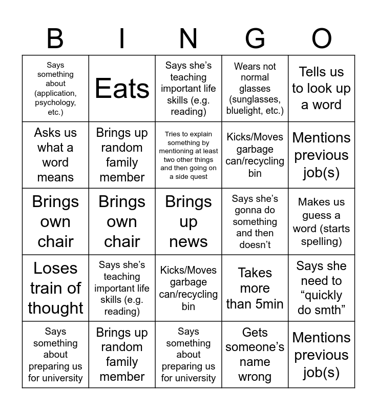 This bingo card has a free space and 51 words: Mentions her in school, Mentions previous job(s), Mentions how stuffy/hot the room is, Says something about preparing us for university, Says she’s teaching important life skills (e.g. reading), Is late, Eats, Forgets to bring one of her many many things/leaves class to go get something, Asks us what a word means, Brings up random friend, Brings up random family member, Wears not normal glasses (sunglasses, bluelight, etc.), Says she need to “quickly do smth”, Takes more than 5min, Makes us guess a word (starts spelling), Loses train of thought, Tries to explain something by mentioning at least two other things and then going on a side quest, Says she’s gonna do something and then doesn’t, Says something about her sight, and does not wear her glasses, Tells us to look up a word, Brings own chair, Gets someone’s name wrong, Says something about (application, psychology, etc.), Kicks/Moves garbage can/recycling bin, Yells at some kids outside being loud, Mentions her in school, Mentions previous job(s), Mentions how stuffy/hot the room is, Says something about preparing us for university, Says she’s teaching important life skills (e.g. reading), Is late, Eats, Forgets to bring one of her many many things/leaves class to go get something, Asks us what a word means, Brings up random friend, Brings up random family member, Wears not normal glasses (sunglasses, bluelight, etc.), Brings up news, Says she need to “quickly do smth”, Takes more than 5min, Makes us guess a word (starts spelling), Loses train of thought, Tries to explain something by mentioning at least two other things and then going on a side quest, Says she’s gonna do something and then doesn’t, Says something about her sight, and does not wear her glasses, Tells us to look up a word, Brings own chair, Gets someone’s name wrong, Says something about (application, psychology, etc.), Kicks/Moves garbage can/recycling bin and Yells at some kids outside being loud.