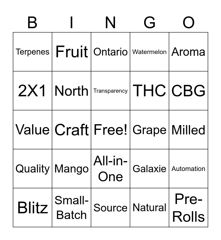This bingo card has a free space and 24 words: Mango, Small-Batch, Transparency, Blitz, Aroma, Terpenes, 2X1, Fruit, Grape, All-in-One, THC, Value, Galaxie, Automation, North, Natural, Milled, Ontario, CBG, Craft, Pre-Rolls, Quality, Watermelon and Source.