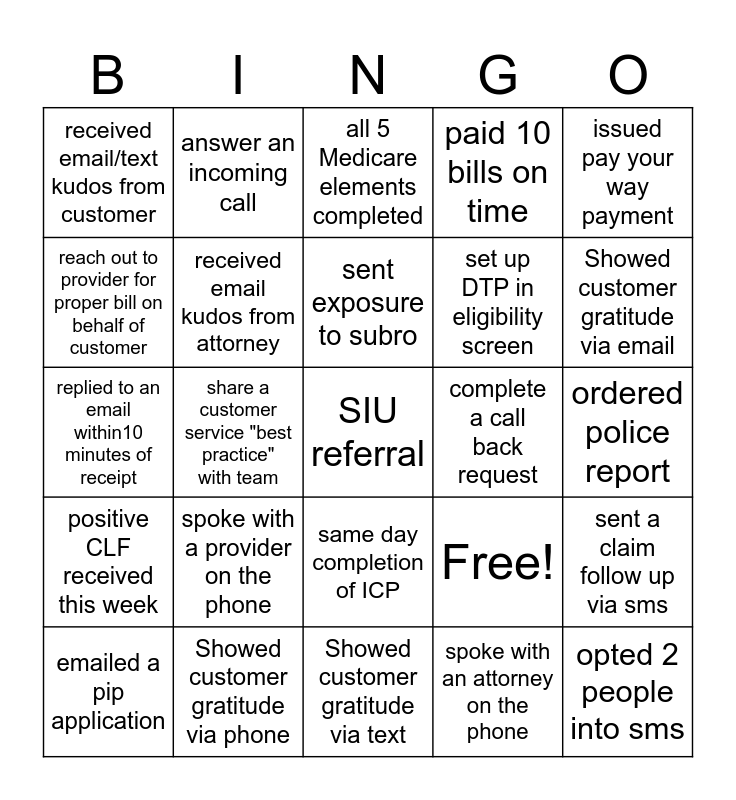 This bingo card has 25 words: spoke with a provider on the phone, Showed customer gratitude via text, sent exposure to subro, emailed a pip application, issued pay your way payment, received email/text kudos from customer, reach out to provider for proper bill on behalf of customer, answer an incoming call, complete a call back request, same day completion of ICP, set up DTP in eligibility screen, replied to an email within10 minutes of receipt, Free!, sent a claim follow up via sms, received email kudos from attorney, opted 2 people into sms, ordered police report, all 5 Medicare elements completed, Showed customer gratitude via email, share a customer service "best practice" with team, SIU referral, Showed customer gratitude via phone, positive CLF received this week, paid 10 bills on time and spoke with an attorney on the phone.