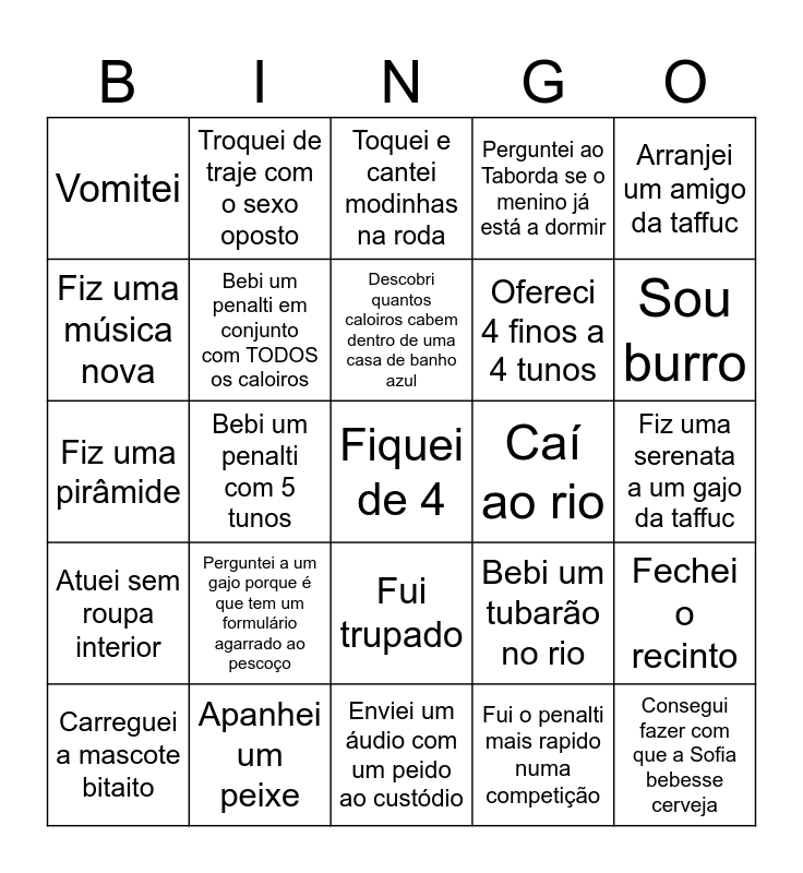 This bingo card has a free space and 24 words: Perguntei a um gajo porque é que tem um formulário agarrado ao pescoço, Apanhei um peixe, Descobri quantos caloiros cabem dentro de uma casa de banho azul, Carreguei a mascote bitaito, Arranjei um amigo da taffuc, Vomitei, Fiz uma música nova, Troquei de traje com o sexo oposto, Caí ao rio, Fui trupado, Ofereci 4 finos a 4 tunos, Fiz uma pirâmide, Bebi um tubarão no rio, Fechei o recinto, Bebi um penalti em conjunto com TODOS os caloiros, Fui o penalti mais rapido numa competição, Fiz uma serenata a um gajo da taffuc, Toquei e cantei modinhas na roda, Sou burro, Bebi um penalti com 5 tunos, Consegui fazer com que a Sofia bebesse cerveja, Atuei sem roupa interior, Perguntei ao Taborda se o menino já está a dormir and Enviei um áudio com um peido ao custódio.