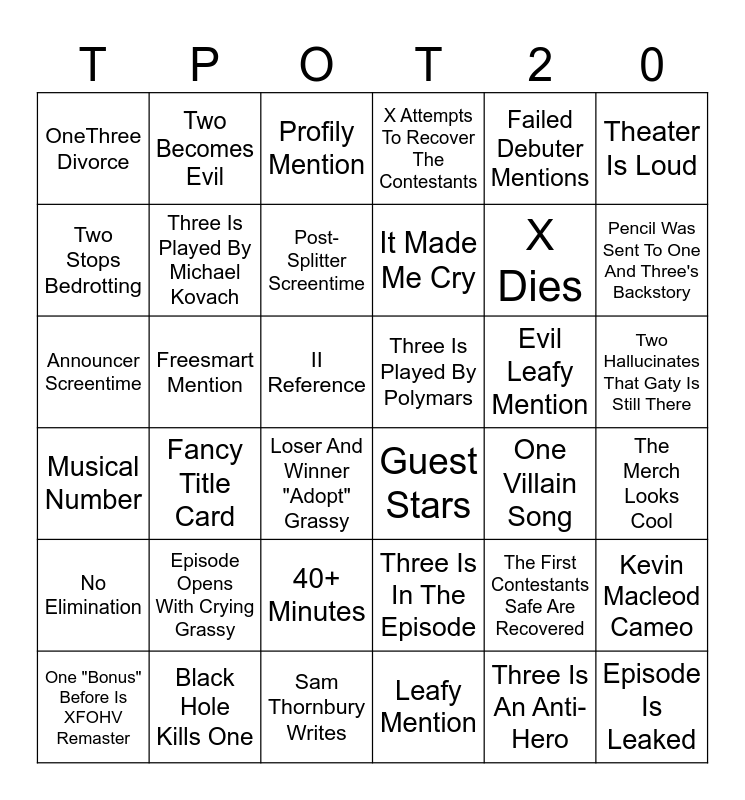 This bingo card has 36 words: Three Is In The Episode, 40+ Minutes, Leafy Mention, Two Stops Bedrotting, Musical Number, Three Is Played By Polymars, Three Is Played By Michael Kovach, Sam Thornbury Writes, Failed Debuter Mentions, The First Contestants Safe Are Recovered, Pencil Was Sent To One And Three's Backstory, X Attempts To Recover The Contestants, Kevin Macleod Cameo, Freesmart Mention, It Made Me Cry, OneThree Divorce, No Elimination, Evil Leafy Mention, Announcer Screentime, Profily Mention, II Reference, Fancy Title Card, Guest Stars, Loser And Winner "Adopt" Grassy, One Villain Song, Two Becomes Evil, X Dies, Black Hole Kills One, Post-Splitter Screentime, Theater Is Loud, Episode Is Leaked, One "Bonus" Before Is XFOHV Remaster, The Merch Looks Cool, Two Hallucinates That Gaty Is Still There, Episode Opens With Crying Grassy and Three Is An Anti-Hero.
