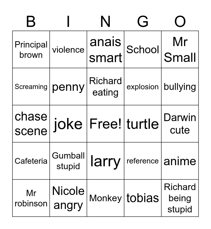 This bingo card has a free space and 24 words: Gumball stupid, Nicole angry, Richard eating, Mr robinson, Mr Small, Principal brown, Screaming, violence, turtle, larry, explosion, chase scene, reference, anime, penny, tobias, Darwin cute, anais smart, bullying, joke, Richard being stupid, Cafeteria, School and Monkey.