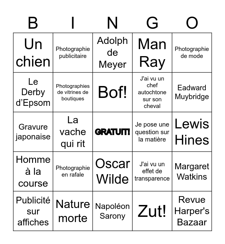 This bingo card has a free space and 30 words: Nature morte, Le cinémascope, La vache qui rit, Eugène Atget, Un chien, Adolph de Meyer, Photographies de vitrines de boutiques, Oscar Wilde, Je pose une question sur la matière, Napoléon Sarony, Lewis Hines, Revue Harper's Bazaar, Zut!, Felice Beato, photographe italien, Eadward Muybridge, J'échappe quelque chose par terre et je m'excuse, J'ai vu un effet de transparence, Homme à la course, Photographie en rafale, Photographie de mode, Gravure japonaise, Astrophotographie, Photographie publicitaire, J'ai vu un chef autochtone sur son cheval, Le Derby d’Epsom, Man Ray, Margaret Watkins, Publicité sur affiches, Bof! and Photographies d'enfants qui dorment dans la rue.