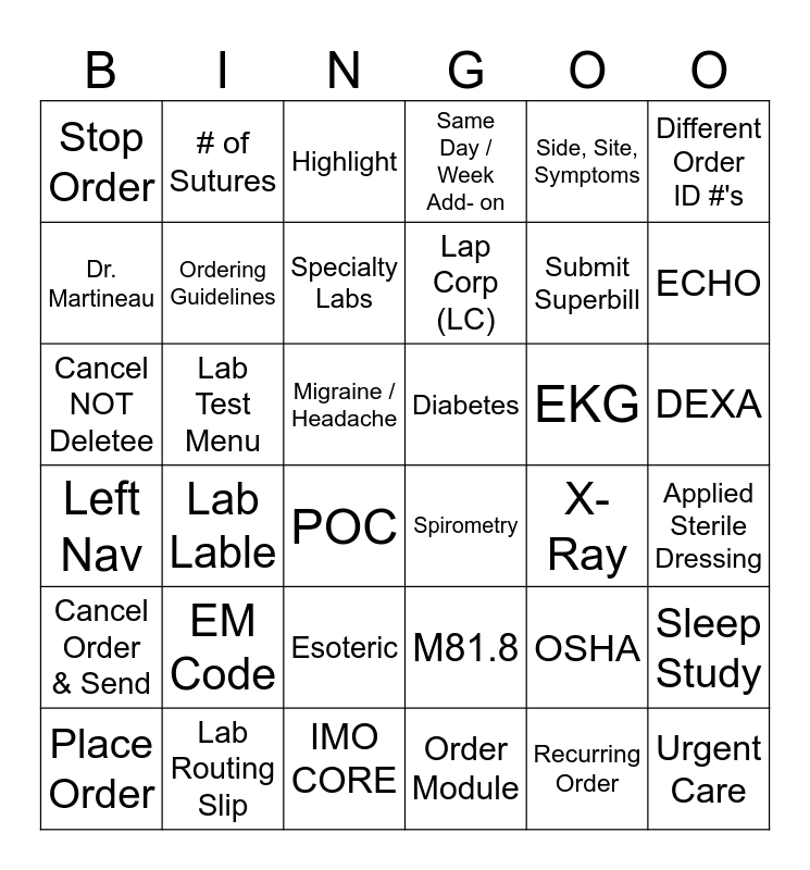 This bingo card has 36 words: M81.8, Esoteric, Order Module, Dr. Martineau, Left Nav, Diabetes, Ordering Guidelines, IMO CORE, Side, Site, Symptoms, OSHA, ECHO, Same Day / Week Add- on, Sleep Study, Lab Test Menu, Lap Corp (LC), Stop Order, Cancel Order & Send, EKG, Cancel NOT Deletee, Highlight, Migraine / Headache, Lab Lable, Spirometry, POC, X-Ray, # of Sutures, Submit Superbill, Lab Routing Slip, Specialty Labs, Different Order ID #'s, Urgent Care, Place Order, Applied Sterile Dressing, DEXA, EM Code and Recurring Order.