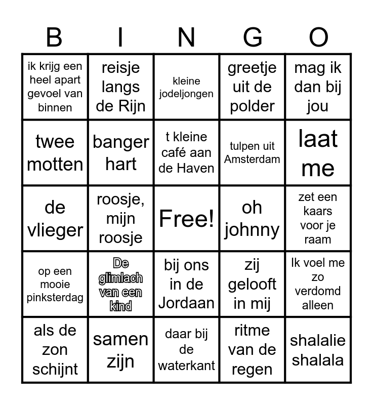 This bingo card has a free space and 24 words: De glimlach van een kind, samen zijn, t kleine café aan de Haven, als de zon schijnt, mag ik dan bij jou, ik krijg een heel apart gevoel van binnen, twee motten, reisje langs de Rijn, oh johnny, bij ons in de Jordaan, tulpen uit Amsterdam, de vlieger, zij gelooft in mij, Ik voel me zo verdomd alleen, banger hart, ritme van de regen, zet een kaars voor je raam, kleine jodeljongen, laat me, roosje, mijn roosje, shalalie shalala, op een mooie pinksterdag, greetje uit de polder and daar bij de waterkant.